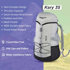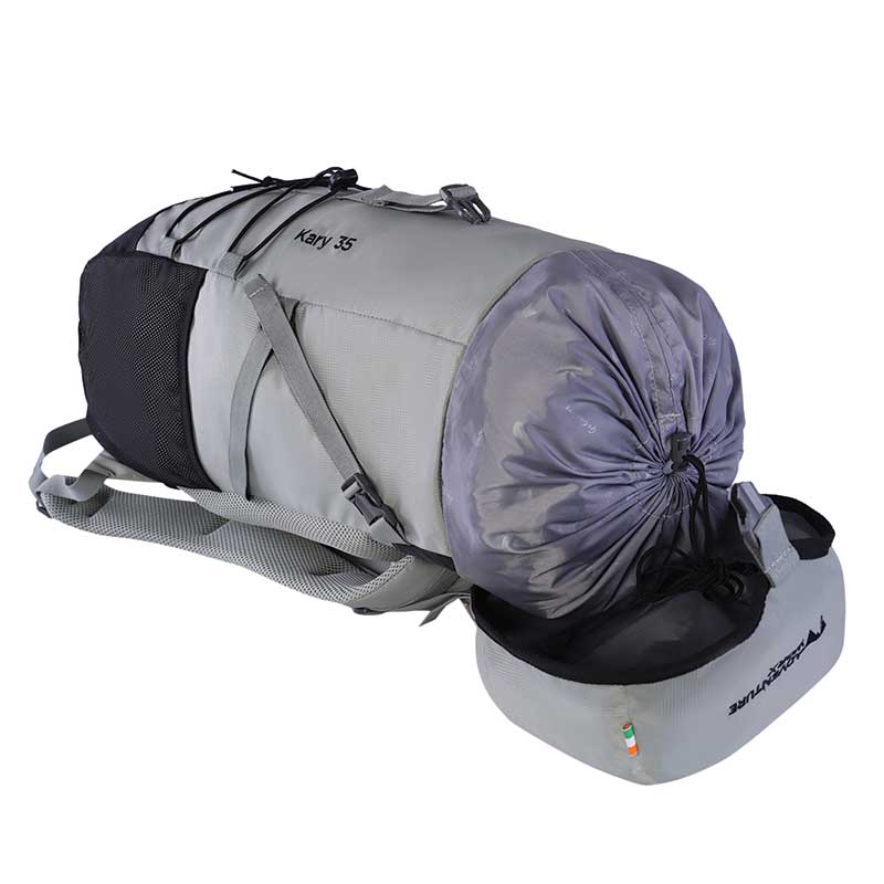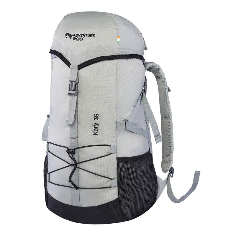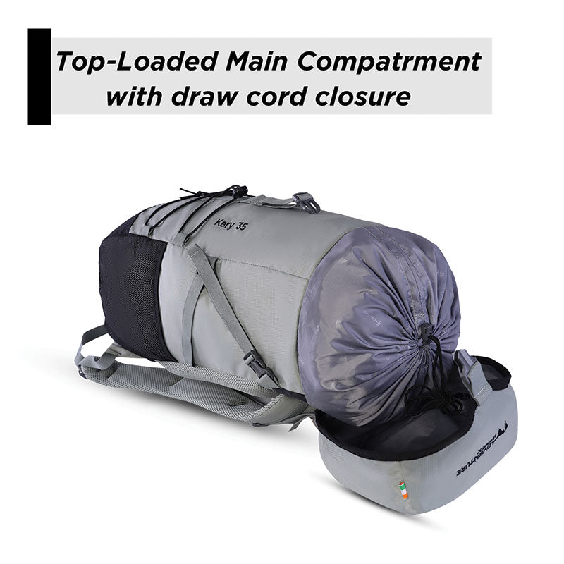 Traveling can be a hassle, especially when you need to carry all your essentials with you. For those who seek a spacious, trendy, and easy-to-carry rucksack that fits perfectly on luggage storage racks in trains, flights, and buses, look no further than our Kary series of rucksacks with a generous 35 Ltr capacity. Designed with your comfort and convenience in mind, the Kary 35 Liter Rucksack is the perfect companion for overnight travel and daily adventures. This lightweight rucksack offers ample space to store all your belongings for overnight travel or day trips. The large top-loading compartment ensures easy access to your belongings, and the cord lock keeps them securely in place. The top hood not only securely closes the compartment but also features a pocket for storing quick-access items like your phone, wallet, or passport. The front bungee cord system allows you to store jackets or other items conveniently when not in use. Equipped with quick-release buckles, the compression straps help you adjust the pack to fit snugly, preventing unnecessary movement during your travels. The unique back panel design with padding provides extra comfort and ventilation, keeping your back cool and dry even during extended wear. The backpack's internal aircraft alloy frame effectively transfers the load, ensuring the back panel stays firm and maintaining a balanced weight distribution