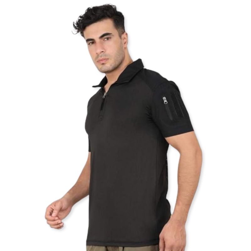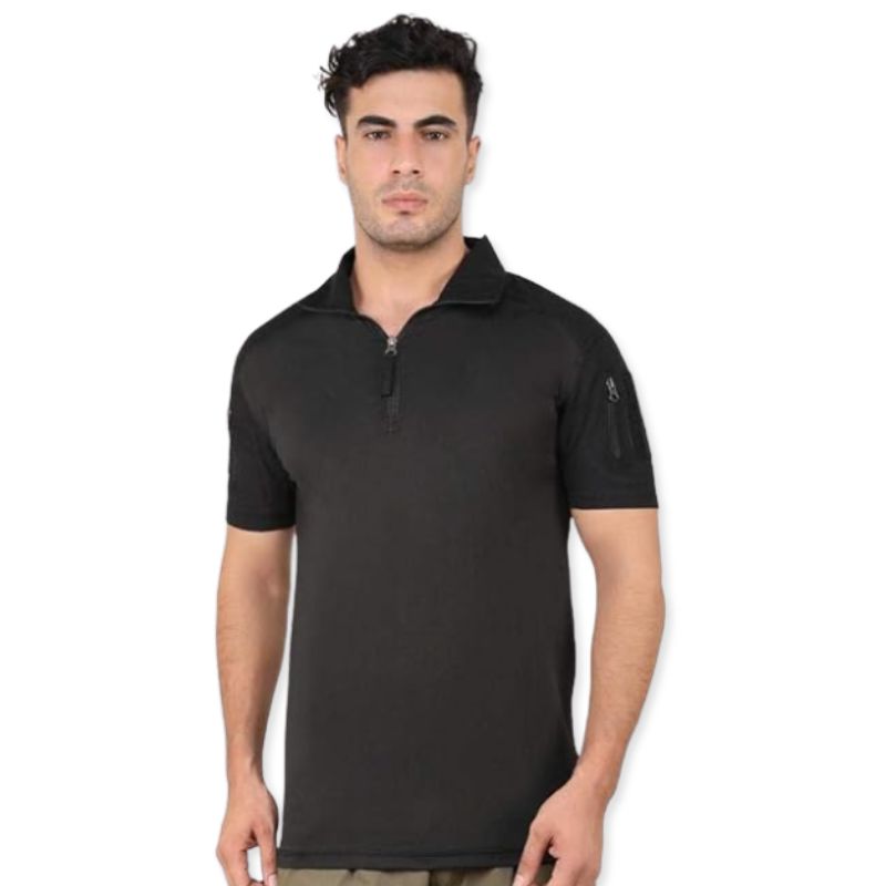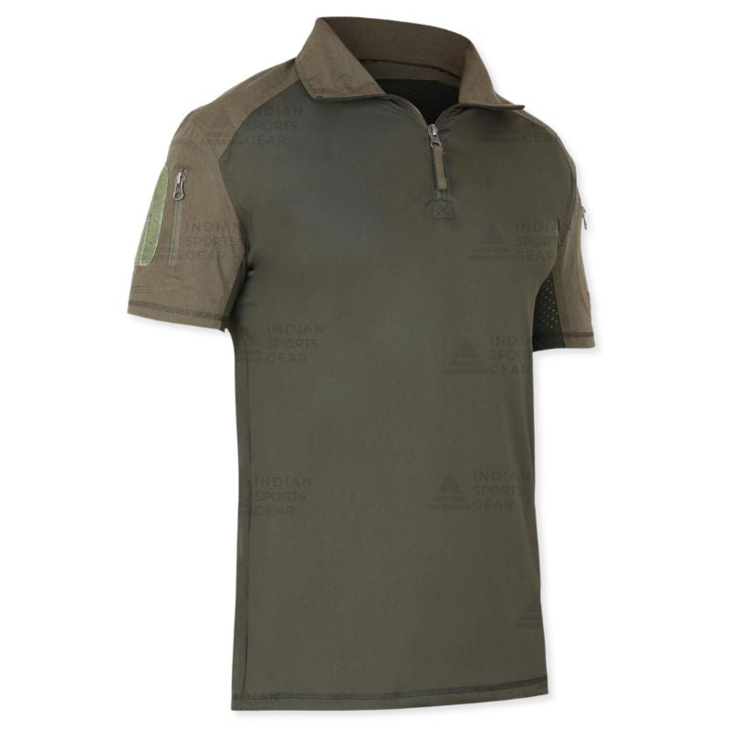 The Indian Sports Gear Men's Tactical Half Sleeves T-Shirt is engineered for durability, comfort, and functionality, making it an ideal choice for outdoor activities, tactical training, and sports. Its lightweight fabric ensures breathability while maintaining strength for rugged use. The 1/4 front zipper allows for adjustable ventilation and easy wear, providing a customizable fit in varying conditions. Reinforced elbow pads add extra protection and resilience, ensuring the t-shirt withstands intense movements and abrasion. Functional arm pockets offer convenient storage for small essentials, keeping items secure during active use. The half sleeves are designed for freedom of movement, allowing unrestricted arm motion in every activity. Precision stitching enhances durability while giving the t-shirt a polished and professional look.