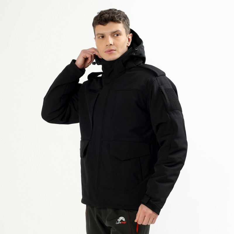 The jacket is equipped with multiple functional pockets, including two large hand pockets with zippers, a chest pocket, and a sleeve pocket, offering ample storage space for essentials like maps, tools, or personal items. The full front zip closure, adjustable cuffs with Velcro straps, and an adjustable hem with a drawcord ensure a customizable fit, enhancing comfort and preventing wind or rain from entering.Jacket features a detachable hood with an adjustable drawcord, allowing for customizable head coverage. Whether navigating through dense forests or commuting in urban settings, the Lammer Men's 2-in-1 SoftShell & Waterproof Jacket combines functionality, comfort, and style to meet the needs of active individuals.